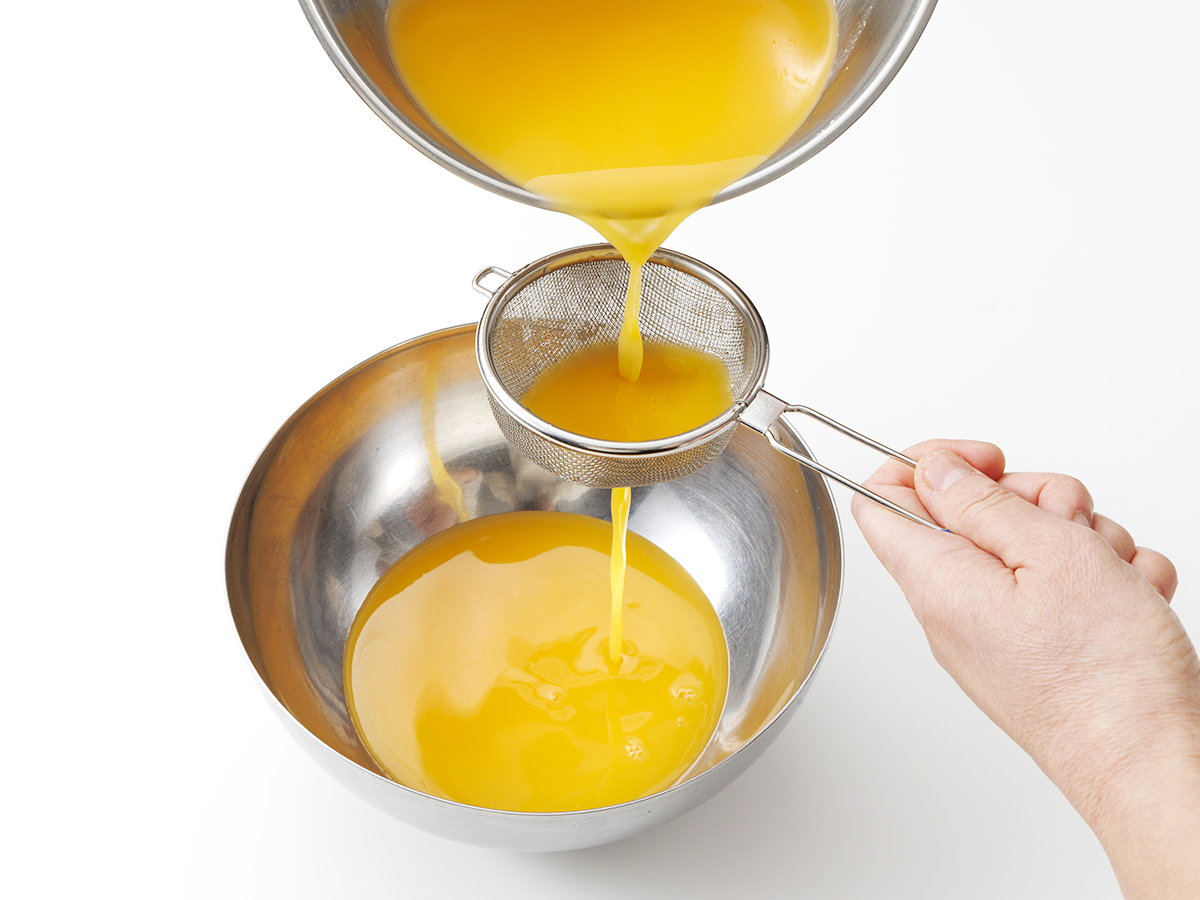 ボウルにお湯、顆粒ガラスープ、酒を入れスープを作り冷ましておく。黒きくらげはぬるま湯につけて戻し、千切りにする。水菜は3cmの長さに切る。ボウルに卵を溶きほぐし、粗熱の取れたスープを少しずつ加えて混ぜ、茶こしなどでこす。