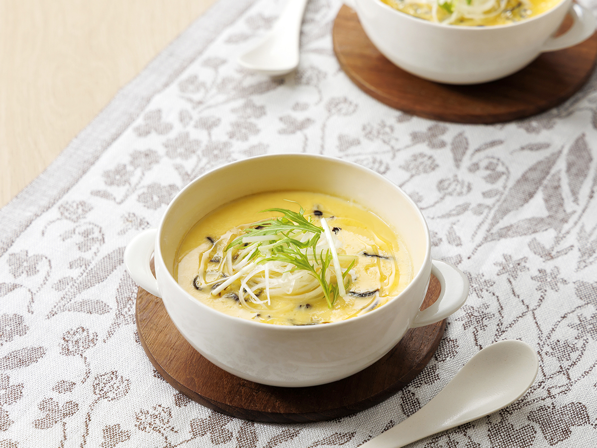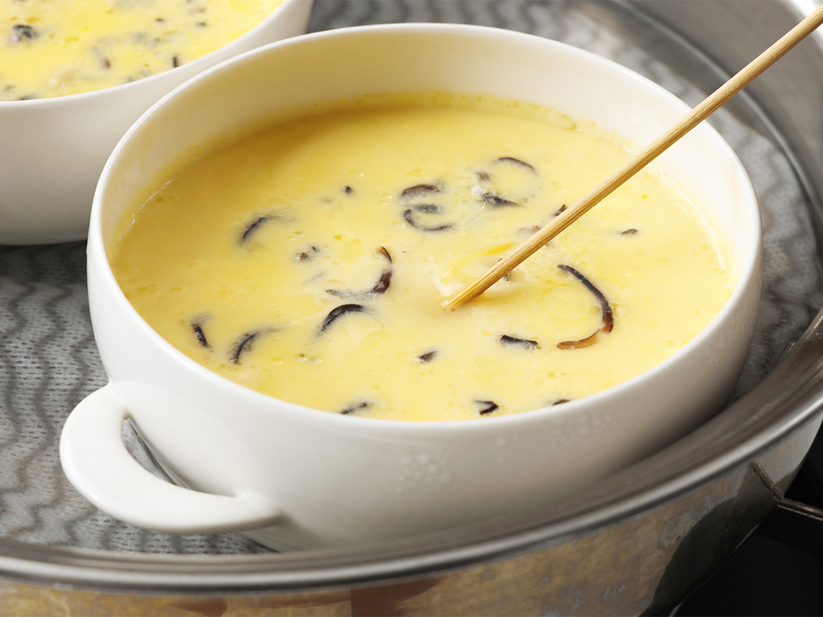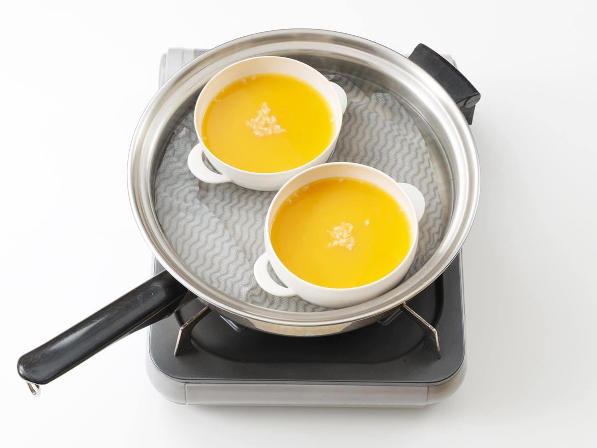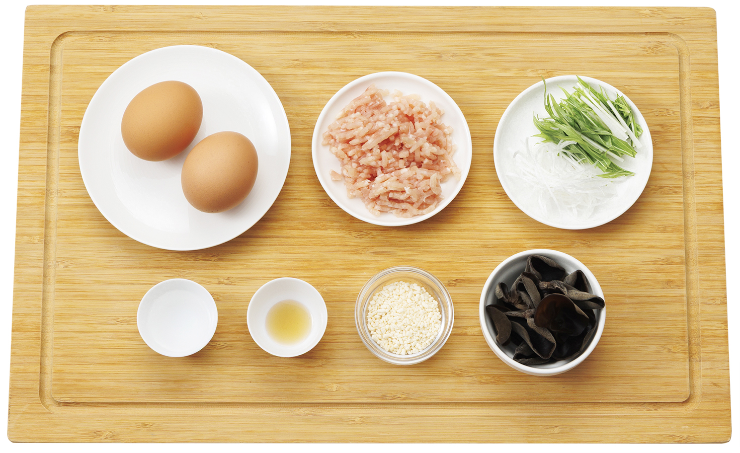 1の卵液にひき肉ときくらげを加え、肉をほぐしながら混ぜる。耐熱容器に分け入れる。フライパンに水を約3cm入れて強火にかけ、沸騰したら一度火を止める。薄めの布巾を敷いて耐熱容器を並べ、蓋をして再び強火にかけ、卵液が白っぽくなるまで加熱する。