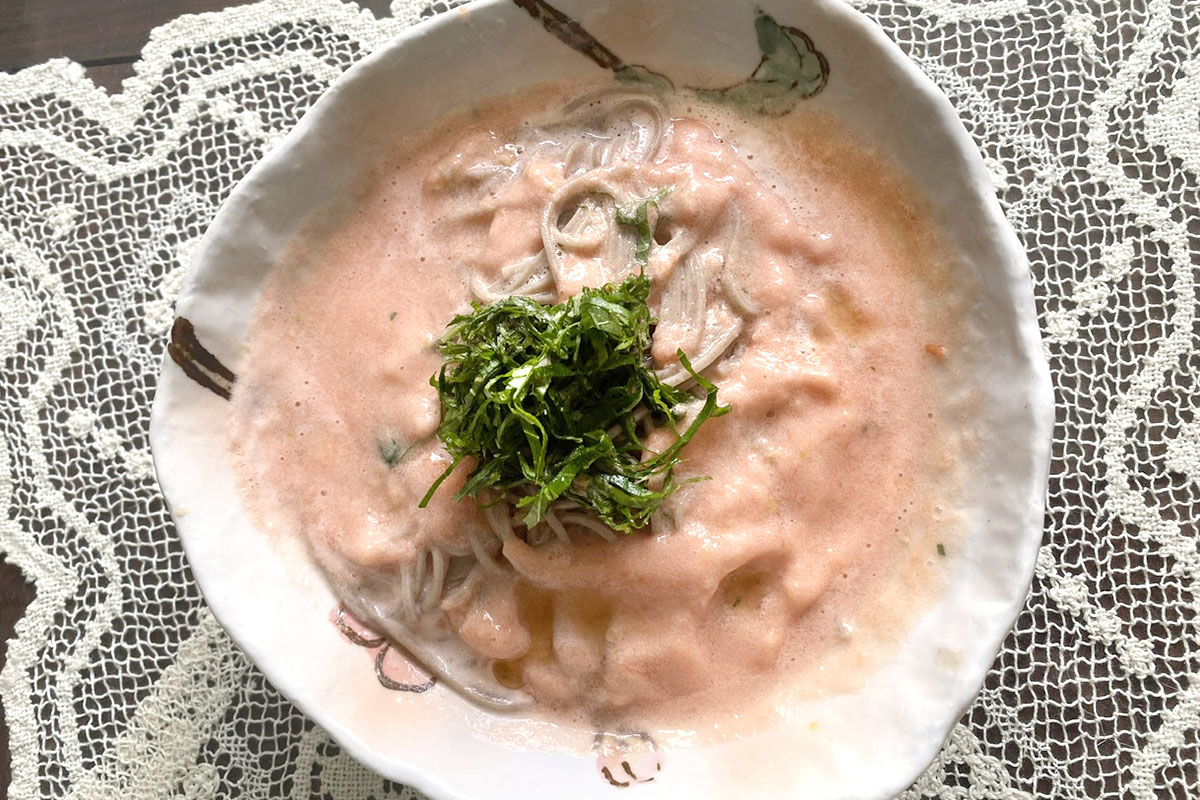 トマトは前日から凍らせておく。凍ったトマトの皮を剥いたら(手で簡単にはがれる)3分程室温に置いておく。大葉は千切りにする。そばは商品表記のゆで時間で茹でておく。